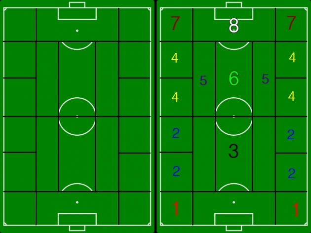 자, 그렇다면 이제 위의 오른쪽 그림에 나타나있는 필자가 개인적으로 분류한 공간들에 대해 소개하도록 하겠다. 경기장의 밑쪽에서 위쪽으로 공격 방향을 정한다는 전제하에 말이다.