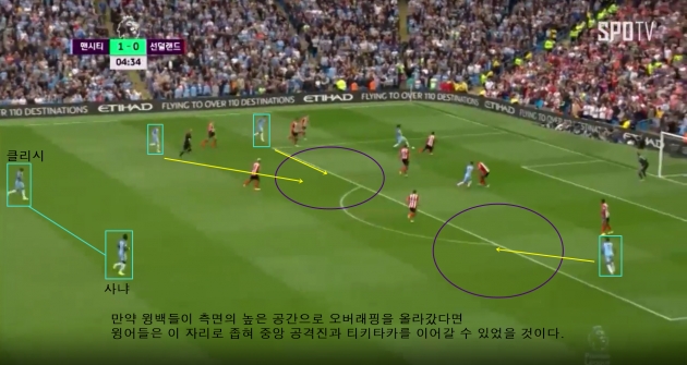 만약에, 과르디올라가 애초부터 맨시티에서 티키타카를 구사하려 했다면 어땠을까? 그렇다면 분명 그는 이번 여름 이적 시장에서 르로이 사네와 놀리토를 영입하지 않았을 것이며, 애초부터 선수들에게 이러한 공간 분배를 요구하지 않았을 것이다. 짧은 패스를 위주로 경기를 풀어 나가야 하는 티키타카는 선수들의 간격을 매우 좁혀야 하기 때문에, 공격의 경계선이 없어져야지 실현이 가능해진다.