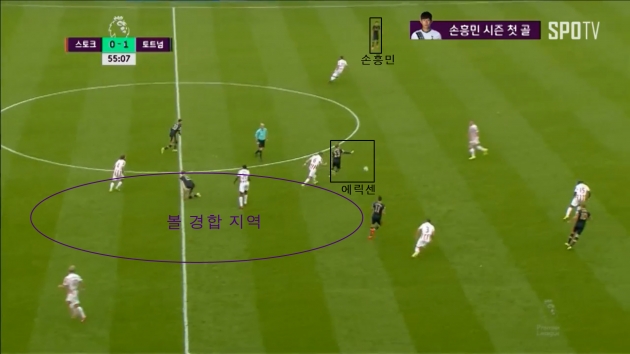그렇다면 이때, 손흥민은 토트넘이 볼을 소유/경합할 이 위치(에릭센이 좁히고 케인이 처진 위치)에서 벗어나 완벽한 반대쪽 측면으로 나오게 된다. 스토크 시티의 수비진은 이 '볼 소유/경합' 지역에 집중되어 있기에 반대편으로 나온 손흥민을 크게 자각하지 못 했을 것이다. 이때 토트넘이 '볼 소유/경합' 지역에서 탈압박이나 볼 탈취에 승리하게 된다면 에릭센이나 다이어와 같은 자원들을 통해 반대편 손흥민에게 롱 볼을 연결하게 되는데, 이 롱 볼을 이어받은 손흥민이 넓은 공간에서 볼을 갖고 질주를 하여 골을 노리는 장면을 포체티노 감독이 원했었다.