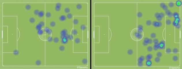알리의 히트맵(좌)과 손흥민의 히트맵(우) (c)squawka