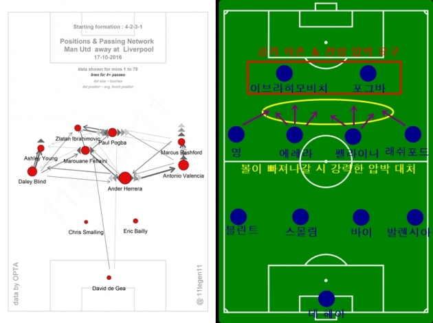 맨유의 이번 경기 패스&포지션 맵 (c)11tegen11 (좌), 맨유의 이번 경기 442 포메이션 메커니즘 (c)이타의 축구 블로그 (우)