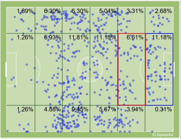 위 그림에서 표시한 빨간색 박스 영역은 맨유가 수비진에서의 본격적인 빌드 업을 시작할 때의 지역을 나타낸 것이고, 빨간색 박스까지 포함하고 있는 파란색 박스는 리버풀의 파이널 써드(리버풀의 입장에서 경기장을 1/3으로 나눴을 때, 그 중 가장 끝에 해당하는 지역. 리버풀의 공격 지역이자 맨유의 수비 지역을 뜻한다.)지역을 나타낸다. 보면 알겠지만, 빨간색 박스로 표시돼있는 - 맨유의 본격적인 빌드업이 시작되는 - 지역은 고작 6.61%밖에 점유하지 못했다는 사실을 알 수 있을 것이다. 그 양쪽 지역이 모두 11.18%를 점유하고 있었다는 것, 그리고 리버풀이 이 지역에서 무려 11.64%를 점유했다는 사실을 감안해 본다면 무리뉴의 이 의도만은 정말 잘 이뤄졌다고 생각한다.