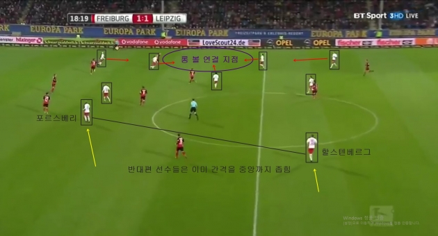 위 <장면 A>를 보라. 라이프치히의 골키퍼 페테르 굴라치가 중원 하프 라인 부근으로 볼을 연결해주고 있는 장면이다. 우리가 여기서 유심히 지켜봐야 할 점은 2가지다. 첫째는 3-5명의 선수들이 롱 볼 연결 지점으로 이동하여 그 공간에서의 수적 우위를 미리 차지하려 하고 있다는 점이고, 둘째는 롱 볼 연결 지점(라이프치히 기준으로 오른쪽에 위치)의 반대 방향에 위치한 포르스베리와 할스텐베르그가 중원의 센터 서클 부근까지 미리 좁혀 라이프치히 전체가 '롱 볼 연결 지점'을 기점으로 촘촘한 선수 간격을 유지하고 있다는 점이다.