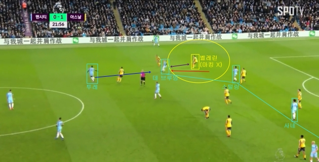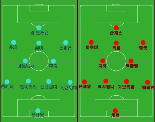 결과적으로, - 이러한 공격 자원들로 골을 넣기 위해서라면 - 무에서 유를 창조해내는 이들의 개인 능력에 대한 의존이 필요해지게 된다. 지난 15/16 시즌 히딩크 임시 감독이 첼시에서 아자르를 최전방 스트라이커로 기용한 것과 비슷한 개념이다. 그리고 개인 능력에 의한, 무에서 유를 창조하는 능력이 후반전에 발휘되니 비로소 2골을 성공시키지 않았는가? 맨시티의 골 장면들을 보라. 첫 번째 골 장면에서는 실바와 사네가, 그리고 두 번째 골 장면에서는 데 브루잉과 스털링의 개인 능력이 발휘됐다. 모두 이들의 무에서 유를 창조해내는 능력이 없었다면 맨시티는 골을 넣는데에 매우 고전했을 것이다.