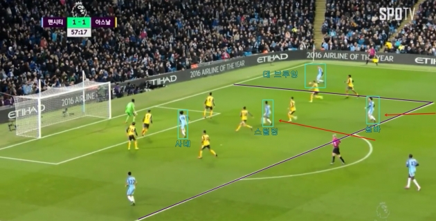 그 첫 번째 이점은 아스날의 수비 진영에서 볼을 소유하는 횟수가 많아졌다는 것이다. 기본적으로 데 브루잉, 사네, 실바, 스털링 4명의 선수 모두가 볼 소유 능력에 강점을 보이는 선수들이다 보니 아스날의 수비 진영에서 볼을 쉽사리 뺏기는 일이 없었다. 이들은 계속해서 위치를 바꿔가며 볼을 안정적으로, 그리고 위협적으로 공유했다. 아스날 수비 입장으로는 쉽사리 강한 압박을 가할 수가 없는 상황이었다. 그 결과 이번 경기 아스날의 수비 진영에서 볼이 머무른 시간이 전체의 37%에 달했으며, 중원 지역에서 49%, 맨시티의 수비 지역에서 14% 머물렀다는 사실을 감안한다면 맨시티가 얼마나 경기를 지배했는지 알 수 있을 것이다. (물론, 이 부분에 대해서는 전진된 센터백 선수들이 볼을 안정적으로 처리해준 탓도 크다.)