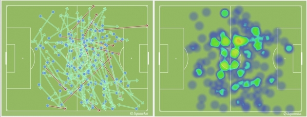 다비드 실바의 이번 경기 히트맵(좌), 패스맵(우) (c)squawka.com