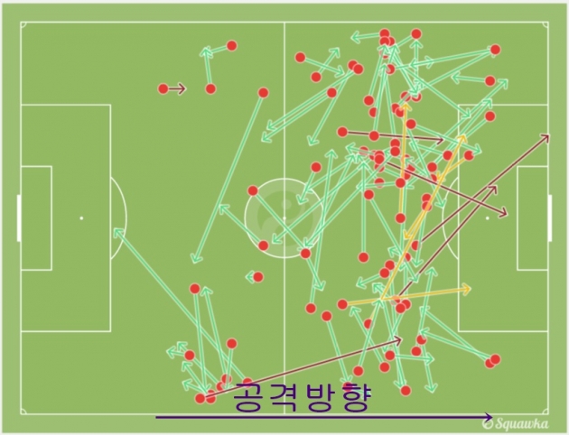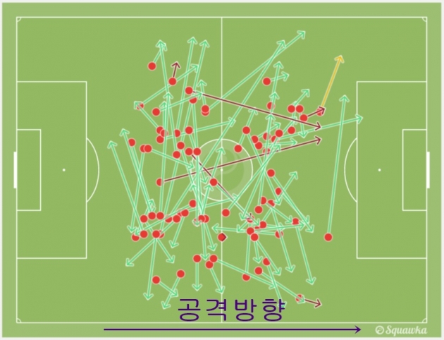즐라탄의 이번 경기 패스맵 (c)squawka.com