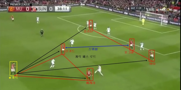 전방의 3톱은 비교적 좁게 포진되어있고 윙어들은 미드필더진을 오가며 중원 싸움을 보태준다. 그리고 그 후방에는 캐릭이 이들을 받쳐주고 있다. 캐릭을 중심으로 '\ /' - 전형적인 4-3-3 대형 - 한 대형이 펼쳐지고 있기 때문에 볼 홀딩에 대한 위치적, 선수의 개인 능력적 안정성이 보장될 수 있는 것이다. 그가 후방에 존재했기 때문에 포그바와 에레라가 페널티 박스 침투를 수비적 부담 없이 진행할 수 있었다.