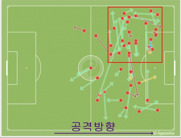 왼쪽 측면을 공격의 시발점으로 잡으면 미드필더 3명과 공격수 3명, 거기다가 축구 지능이 매우 뛰어난 블린트까지 합세하여 볼을 공유할 수 있다. 그리고 이곳에서 볼을 점유하다 오른쪽 풀백 발렌시아를 이용한 오버로드 투 아이솔레이트(맨유가 왼쪽 측면에서 볼을 점유할 경우 선덜랜드 수비진들이 이곳으로 몰리게 된다. 이때 비교적 수비진이 적은 맨유의 오른쪽 공간으로 한 번에 볼을 전개시키는 전술)를 실행시킬 수도 있다. 실제로 이날 데 헤아는 13번의 패스 중 6번의 패스를 왼쪽 방향으로 시도했다.