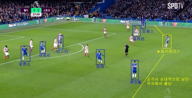 그리고 이러한 백3와 백4의 혼용, 센터백의 중원 가담으로 인해 첼시의 두 번째 골을 성공시킬 수 있었다. 왼쪽의 아자르에서부터 오른쪽의 모제스까지 방향이 전환되는 과정 속에 파브레가스와 아스필리쿠에타가 참여되니 원활한 공격을 진행할 수 있었다. 또한 볼이 왼쪽에서부터 오른쪽으로 넘어가는 사이에, 중앙 미드필더인 캉테는 상대 페널티 박스 바로 바깥쪽에 위치하면서 스토크시티의 수비진들을 안쪽으로 눌러줬다.