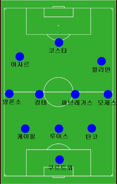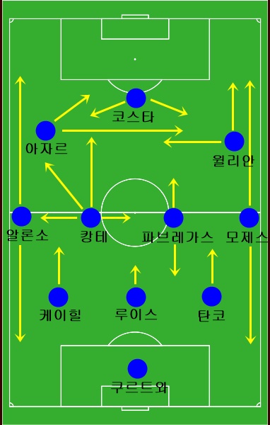 아스날전 3-0 패배 이후, 콩테 감독의 백3 포메이션은 거의 고정적이다싶이 흘러갔었다. 케이힐과 루이스, 아스필리쿠에타가 센터백을, 알론소와 모제스가 윙백, 그리고 캉테와 마티치가 중앙 미드필더를 형성하며 아자르 - 코스타 - 페드로를 배치한 공격 라인을 둔 3-4-3 포메이션이 한동안 첼시 경기의 선발 라인업을 꿰찼었다.