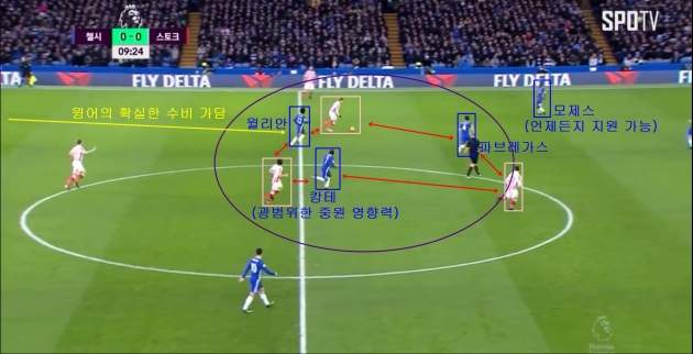 모제스와 캉테야 이번 시즌 첼시에서 공/수 모두에 매우 큰 공헌을 해주고 있는 선수들이고, 윌리안은 수비 가담 면에서 약점을 보이는 편이지만 활동량 하나는 정말 좋은 선수다. 때문에 첼시의 '공격 → 수비 상황'에서 이 세 선수의 영향력으로 파브레가스의 단점을 보완할 수 있었다.