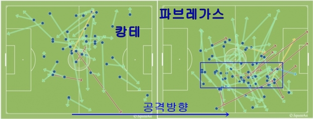 캉테와 파르베가스의 패스맵 비교 (c)squawka.com