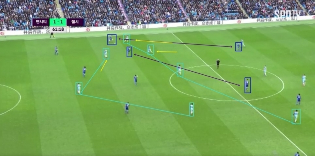 상대 공격진의 간섭에서 자유로워진 첼시 수비진들은 공을 몰고 자유롭게 하프라인 근처까지 올라갈 수 있게 되었다. 그렇게 공격진과의 간격이 좁아지다 보니 수비진에서 공격진으로 이어지는 직접적인 패스가 가능해졌으며, 이는 - 캉테와 마티치의 중원 조합이라는 - 전방으로 종패스를 공급하기 힘들다는 첼시 중원 조합의 단점을 극복해주는 또 다른 수가 되어주기도 하였다.