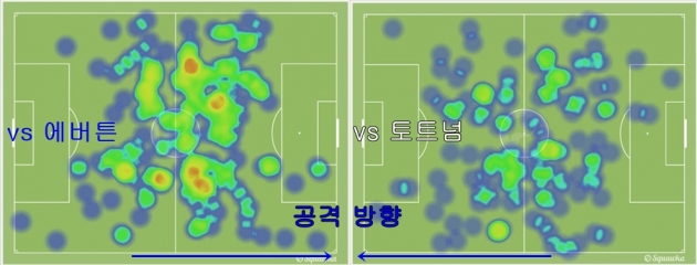 캉테와 미티치의 에버튼전(좌), 토트넘전(우) 히트맵 비교 (c)squawka.com