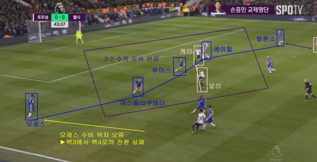 홈에서 첼시를 상대한 토트넘은 '알리-케인-에릭센'을 3톱으로 둔 3-4-3 포메이션을 들고 나왔지만, 실제 경기 내에서는 에릭센을 조금 쳐진 위치에 배치시키며 케인과 알리를 최전방에 묶어놓은 진형을 펼쳤었다. 여기서 첼시의 패착 원인이 나왔다. 첼시는 이 두 명의 선수들을 백3의 센터백들로만 상대해도 됐었지만, 이 과정에서 모제스까지 최후방 수비 라인에게 묶이며 토트넘의 2-3선 자원에게 패스를 공유할 여유 공간을 너무 많이 내줬던 것이었다. 쉽게 말해, 모제스가 수비시 아무것도 하지 않은 상태로 수비 라인에 묶이며 첼시의 미드필더진이 토트넘과의 2선 싸움에서 수적으로 밀리고 만 것이다.