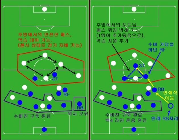 더군다나 양 팀의 포메이션이 포지션마다 '1 vs 1'구도로 펼쳐지게 되는 3-4-3 포메이션이란 것을 감안해 본다면, 중원 싸움에서 밀리는 것이 얼마나 치명적인 것인지 알 수 있을 것이다.