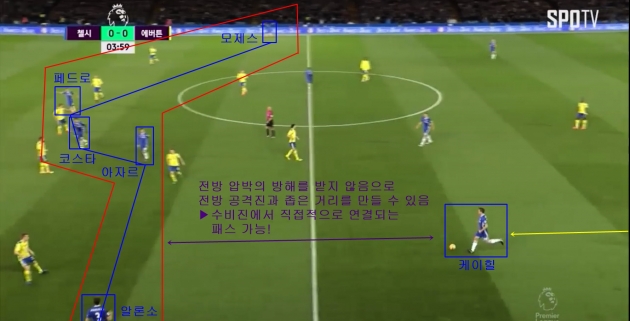 또한 양쪽 윙백인 알론소와 모제스 역시 자유롭게 상대 공격진으로 올라갈 수 있게 되었다. 상대가 전방 압박을 가할 경우, 이들은 첼시의 윙백이기 때문에 수비진으로 내려와 볼을 상대 압박으로부터 지켜내야 하는 임무를 맡아야 했다. 하지만 첼시의 빌드업 상황에서 상대가 전방 압박을 가하지 않고 뒤로 물러서서 수비를 한다? 그렇게 된다면 모제스와 알론소가 굳이 첼시의 수비진에 머무를 필요가 없어져버리고 말 것이다. 그리고 위 장면과 같이 공격 라인으로 합류하여 상대 수비를 공략하는 윙어 역할을 맡게 된다.
