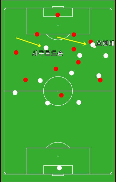 스완지의 두 번째 골 장면을 복기해보자. 요렌테의 오른쪽 측면에서의 볼키핑에 의해 리버풀 수비진들이 한쪽으로 몰리게 되었고, 반대쪽에 광활한 공간을 얻은 스완지는 재빠르게 공격 방향을 전환시켰다. (이때 시구르드손은 요렌테 때문에 중앙으로 좁힌 상태) 여기서 볼을 잡은 왼쪽 윙백 올손이 동료와의 2대 1패스로 왼쪽 측면을 돌파하게 되었는데, 여기서 중요한 점은 시구르드손이 중앙 페널티 박스 안에 위치하고 있었다는 점이다. 때문에 올손이 왼쪽 측면에서 볼을 홀딩하고 있을 때 후방에서의 토마스 캐롤이 자유롭게 왼쪽 측면으로 쇄도할 수 있었고, 이것을 본 올손이 그에게 볼을 넘겨주자 캐롤이 환상적인 크로스를 올려 요렌테가 멋진 헤더골을 성공시키게 된다. 결과적으로 요렌테의 오른쪽 이동, 그에 따른 시구르드손의 중앙 이동, 그리고 중앙 미드필더들의 광범위한 활동 영역이 모두 어우러져 만들어낸 환상적인 골이었다.