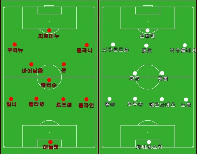 클롭의 리버풀은 4-3-3을, 클레멘트의 스완지는 4-2-3-1 포메이션을 들고 나왔다. 클레멘트 감독 스쿼드의 변화라면 지난주 스완지 시티가 완전 영입한 토마스 캐롤를 코크, 페르와 함께 중원에 배치시켰다는 것이다. 후에 글을 쓰면서 차차 소개하겠지만, 이날 스완지는 4-2-3-1 포메이션을 들고 나오며 모든 선수들이 공격시 유동적인 움직임, 그리고 수비시에는 조직적인 형태를 가져가며 리버풀을 꺾었었다.