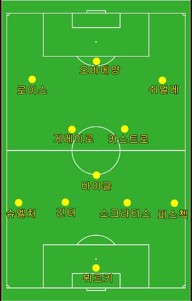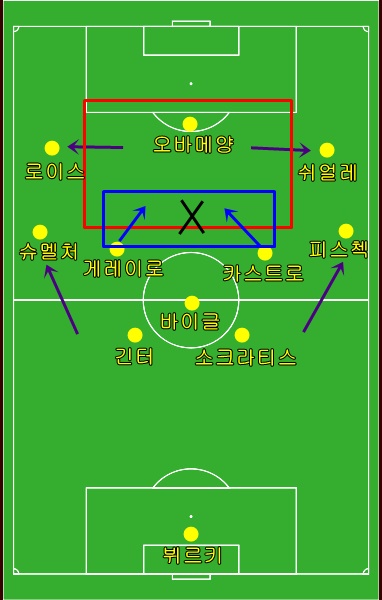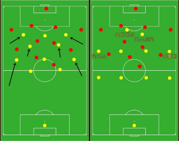 여기까지는 구조적으로 나쁠 것이 없었지만, 좌우 윙어인 로이스와 쉬얼레가 앞서 소개했듯 측면에 집중하여 플레이하다 보니 오바메양이 자연스럽게 고립되는 장면이 펼쳐지게 되었다. 장점을 살리기 위해 밑선으로 내려오지 않은 오바메양의 뒤를 받쳐줄 선수가 없는 것이다. 그렇다 보니 팀의 플레이에 참여하는 횟수가 점점 적어지게 되었고, 결국 그는 이번 경기에서 총 13번의 패스밖에 시도하지 못하였다.