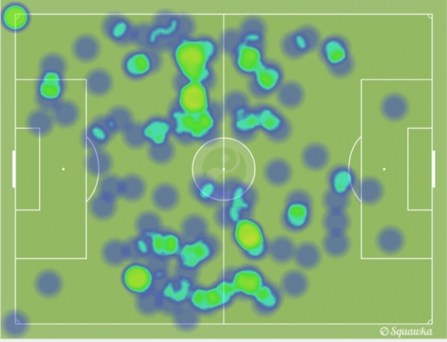 물론 쉬얼레와 로이스의 히트맵만을 본다면 이들이 중앙 지향적으로 뛰었다고 생각할 수도 있다. 하지만 패스맵을 같이 본다면 그 생각이 달라질 것이다. 이들이 히트맵에서 중앙 지역에 상당히 위치했던 까닭은 앞서 소개한 전방 압박 장면 때문이며, 좌우 윙백들의 자유로운 오버래핑에 의해 중앙 지역에 위치했을 때도 어느 정도 있었지만 이들이 실제로 플레이에 영향을 끼쳤던 지역은 대부분 측면이었다.