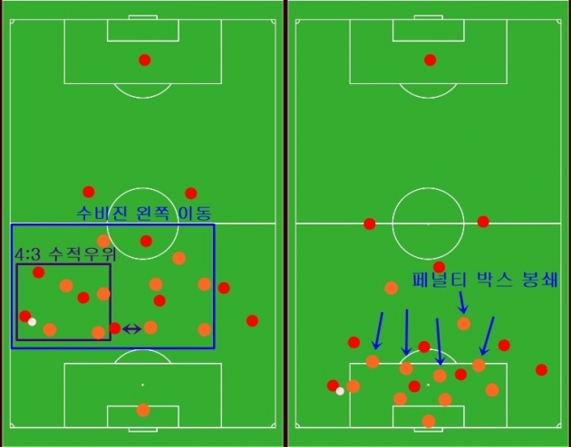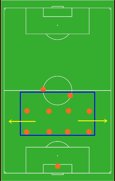하지만 헐시티는 프리미어리그 내 객관적인 선수 전력이 떨어지는 팀이기 때문에 아무리 측면에서의 수적 우위를 가져간다 한들 결국 상대 공격수들에게 공간을 허용해줄 공산이 매우 클 것이다. 때문에 헐시티의 수비진들이 상대 측면 공격을 막아내지 못했다면 수비수들과 미드필더들은 모두 순간적으로 페널티 박스 안으로 돌어와야 한다. 대략 8-9명의 선수들이 페널티 박스 안에서 상대 크로스를 막아내야 한다는 것이다.