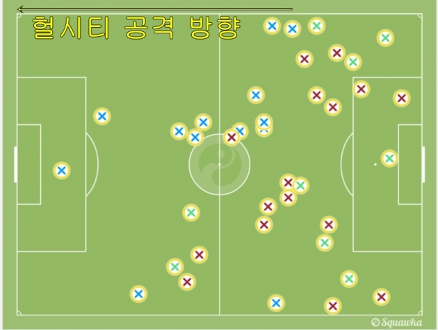 헐시티 수비의 또 다른 특징은 전체적인 수비 진영의 좌우 유동성이 매우 유연하다는 것이다. 앞서 소개했듯 헐시티의 수비 진영이 '좁은 간격을 유지하며 선수들 간의 즉각적인 커버링'을 원칙으로 하다 보니 상대가 페너트레이션(상대의 라스트 30m 지점에서부터 공격을 전개하는 과정) 과정에 돌입했을 때는 자연스레 볼을 측면 쪽으로 돌리게 된다. (실제로 맨유는 26%, 리버풀은 28%만을 중앙 방향으로 공격했다.)