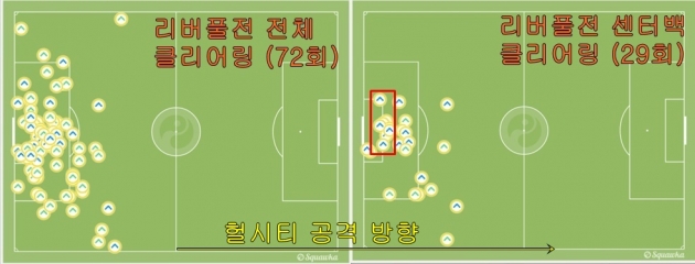 헐시티는 지난 리버풀전에서 총 72회의 클리어링을 성공해냈다. 그리고 그 중 50회를 페널티 박스 안에서 처리했으며, 두 센터백 라노키아와 맥과이어는 전체의 약 40%에 해당하는 29번의 클리어링을 해냈다. 그리고 이중 대다수가 골 에어리어 부근에서 이뤄졌다. 이러한 박스 안 수비를 헐시티가 매우 집중력 있게 해냈기 때문에 맨유와 헐시티를 상대로 무실점을 기록할 수 있었다.