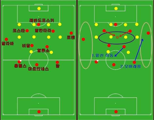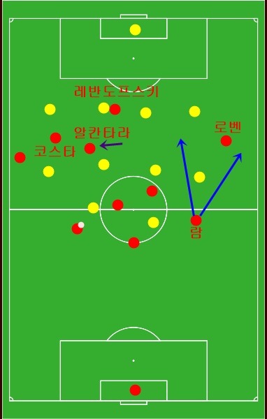 그래서 안첼로티 감독이 생각해낸 것이 코스타와 알칸타라를 왼쪽 측면에 배치시킨 것이었다. 측면은 중앙보다 압박이 비교적 덜한 지역이다. 때문에 이들이 왼쪽으로 이동할 경우 기존 중앙에 있었을 때보다 뒷선에서 배급되는 볼을 받기가 조금 더 쉬워진다. 그리고 중앙 미드필더 알론소와 비달의 빌드업 시작 지점을 조금 낮추는 대신 람의 오버래핑 빈도를 높였다. 레반도프스키 역시 간격 유지를 위해 왼쪽으로 이동했던 터라, 오버로드 투 아이솔레이트의 원칙에 의해 로벤이 어느 정도 고립되긴 하되 람의 공격 진영 진출로 완전한 고립은 막아주는 것이다.