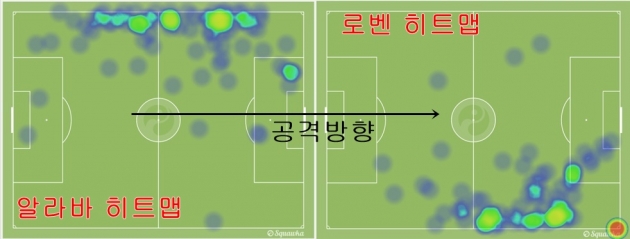 로벤과 알라바의 이번 경기 히트맵 (c)squawka.com