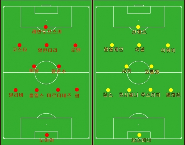 안첼로티가 아스날의 전방 압박에 대한 대비책을 갖고 나오게 된다면, 그는 분명 뮌헨의 핵심 패스 줄기가 되는 알론소의 고립과 봉쇄를 가장 먼저 생각하게 될 것이다. 그래서 준비한 것이 두 중앙 미드필더 비달과 알론소를 경기 내에서 계속 붙어 다니게 한 것이다. 분명 뮌헨의 스트라이커가 상대 수비 뒷공간을 노리는데 좋지 않은 레반도프스키인만큼 아스날도 어느 정도 라인을 올려서 수비를 할 것인데, 이 경우 뮌헨이 공격 상황에 돌입했다 해도 아스날의 높아진 진영 때문에 알론소가 외질과 산체스와 같은 상대 1선 자원들에게 막힐 우려가 있었기 때문이었다.