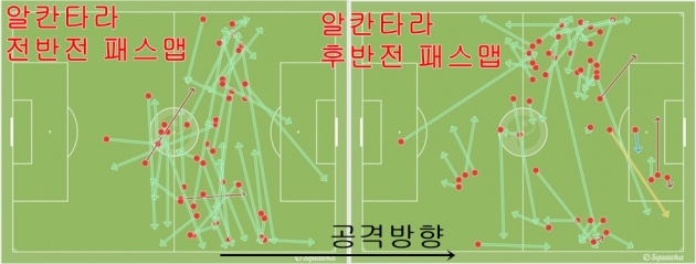 연계 역할을 맡은 알칸타라의 전반전(좌), 후반전(우) 패스맵 비교 (c)squawka.com